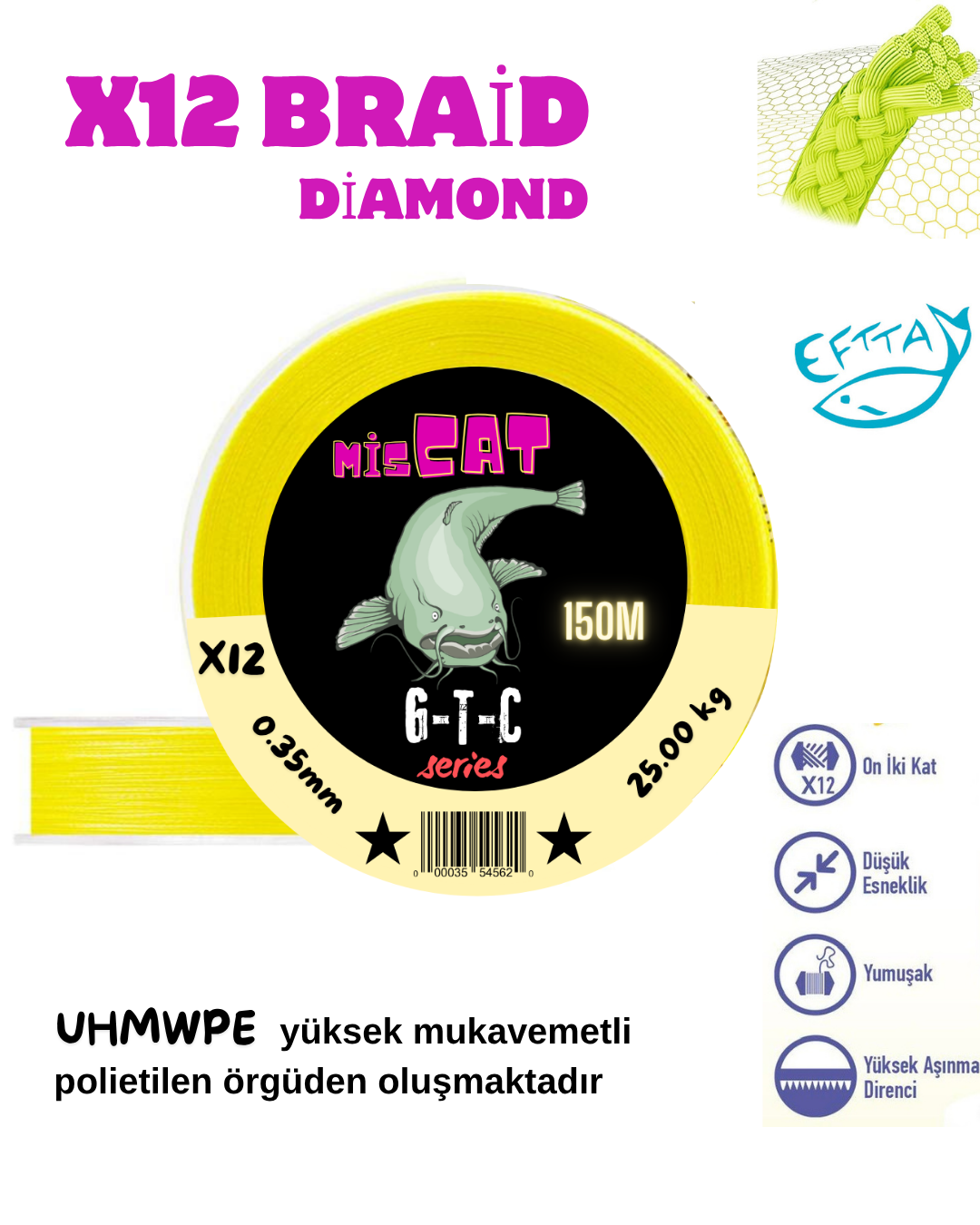 misCAT G-T-C X12 Braid serisi ile maxsimum performansa sahip olun. 12 kat UHMWPE yüksek mukavemetli polietilen örgüden oluşan bu ip en zorlu avlarda bile aşınmalara dayanır.